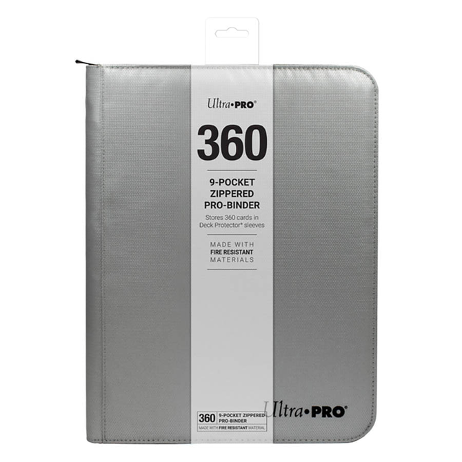A Silver 9-Pocket Zippered Pro Card Binder from Ultra-Pro with item number UP15945.