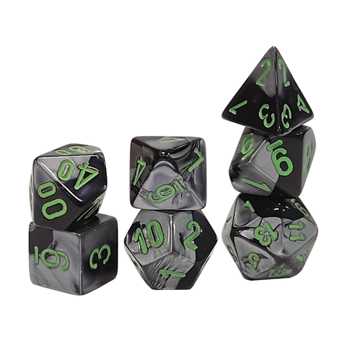 Black-Grey w/ Green is a Mini 7-set Polyhedral Dice Set from the Gemini line by Chessex with the item number CHX20645.