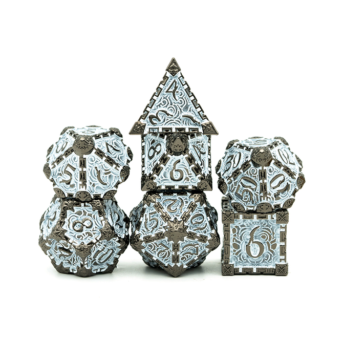 Steam Punk Brushed Patina Metal Dice - Silver is a Polyhedral 7-Die Set by Gameopolis Dice with the item number ME-ST06.