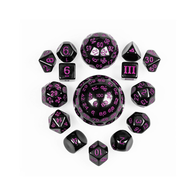 Black w/ Purple is a 15 piece set d3-d100 dice by Gameopolis Dice with the item number AC-BL61.