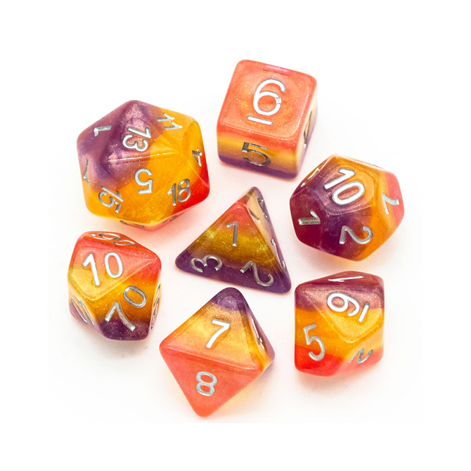 Glitter Layer Dice - Purple & Yellow is a Polyhedral 7-Die Set by Gameopolis Dice with the item number RE-LA08.