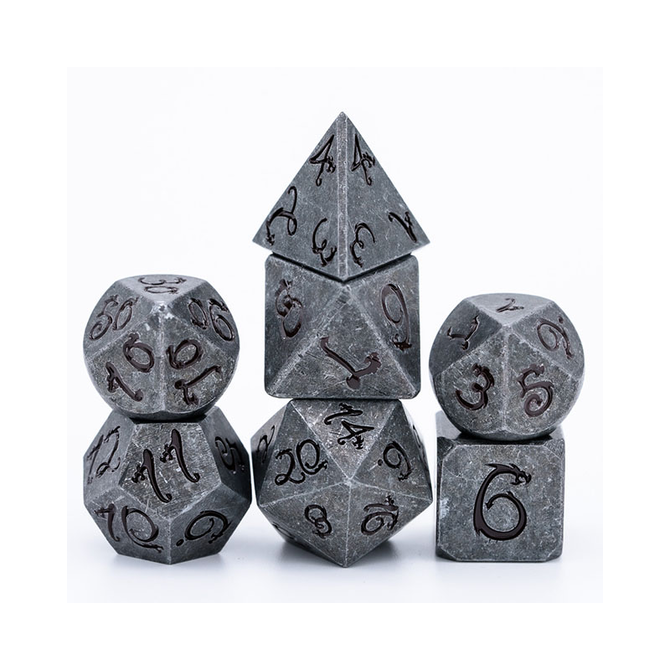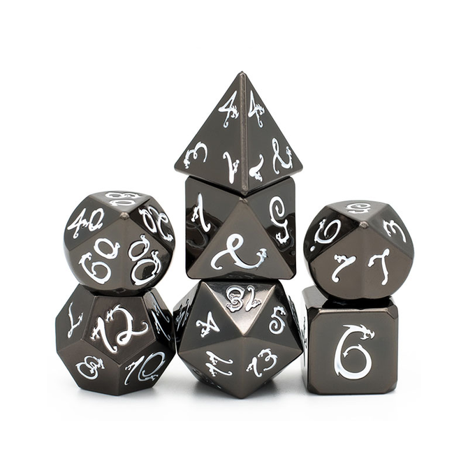 Black Nickel Metal Dice w/ White Dragon Font is a Polyhedral 7-Die Set by Gameopolis Dice with the item number ME-DR30.