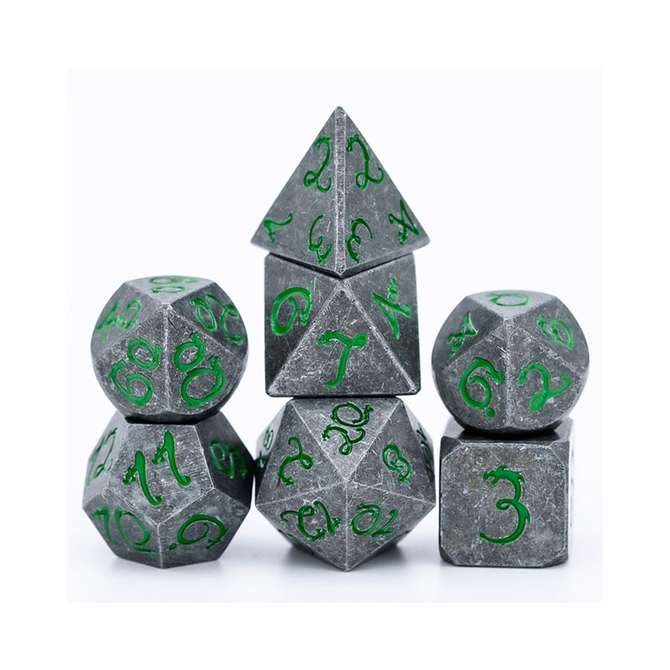 Old Metal w/ Green Dragon Font is a Polyhedral 7-Die Set by Gameopolis Dice with the item number ME-DR44.