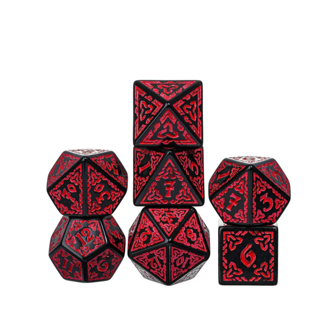 Acrylic Pattern Dice - Celtic Knot - Red is a Polyhedral 7-Die Set. Gameopolis Dice - item number AC-CK01.