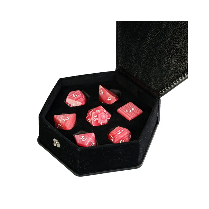 Agate Gemstone Dice w/ Black PU Leather Hexagon Box - Red w/ White is a Polyhedral 7-Die Set from Gameopolis Dice with item number GE-UD92.