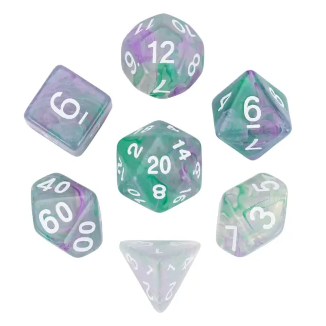 Green & Purple Acrylic Two-Color Swirl Translucent Dice Polyhedral 7 Set. Gameopolis Dice - item number AC-BL104.