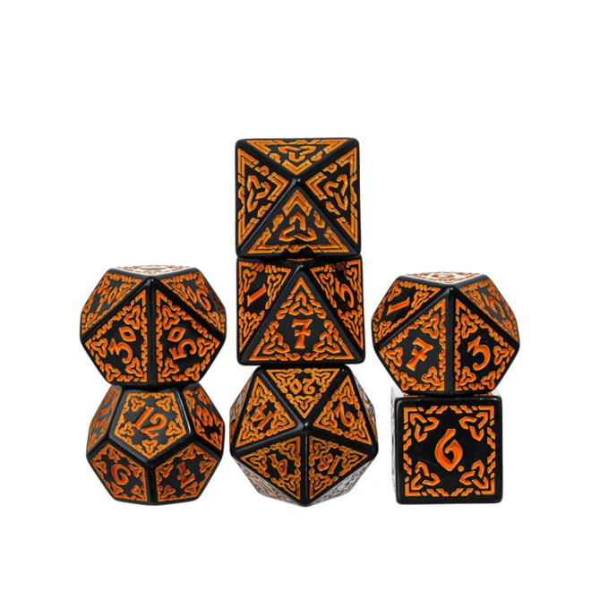 Acrylic Pattern Dice - Celtic Knot - Orange is a Polyhedral 7-Die set. Gameopolis Dice - item number AC-CK04.