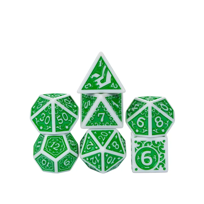 Acrylic Pattern Dice - Irregular - Green w/ White is a Polyhedral 7-Die Set. Gameopolis Dice - item number AC-DY01.