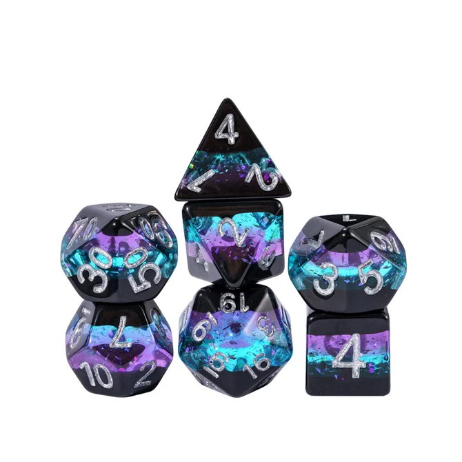 Black, Purple, & Blue w/ Silver Layered Glitter Dice is a Polyhedral 7-Die Set. Gameopolis Dice - item number RE-LA11.