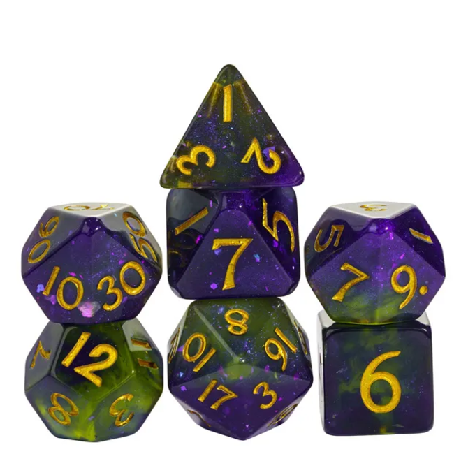 Purple & Green Resin Galaxy Corner Cut Polyhedral 7-Die Set from Gameopolis Dice with item number RE-QJ003.