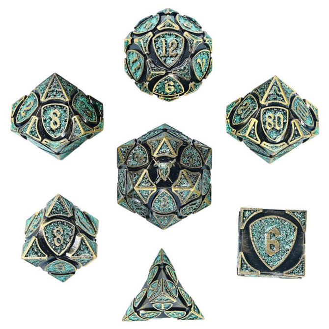 Ancient Bronze w/ Green Glitter Fighter Solid Metal Polyhedral 7-Die Set from Hymgho Premium Gaming with item number HYO0457.