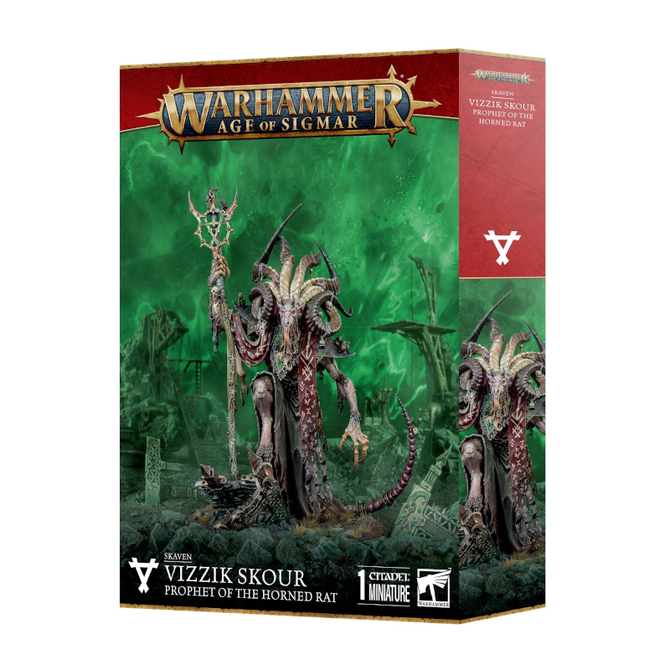 Vizzik Skour Prophet of the Horned Rat is part of the Skaven faction for the miniatures game Warhammer: Age of Sigmar by Games Workshop with item number 90-20.