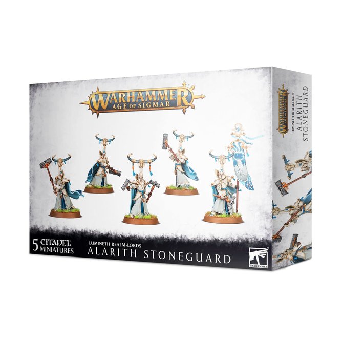 Alarith Stoneguard is a part of the Lumineth Realm-Lords faction for the miniatures game Warhammer: Age of Sigmar by Games Workshop with the item number 87-54.
