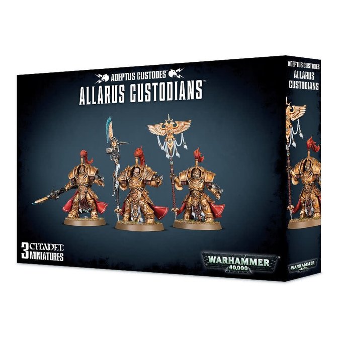 Allarus Custodians is a part of the Adeptus Custodes faction for the miniatures game Warhammer 40K by Games Workshop with item number 01-13.