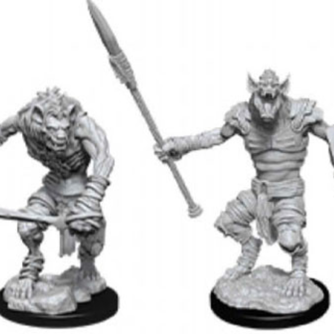 The Gnoll & Gnoll Flesh Gnawer are from Nolzur's Marvelous Unpainted Miniatures by Wizkids for Dungeons & Dragons (D&D) with item number WZK90066.